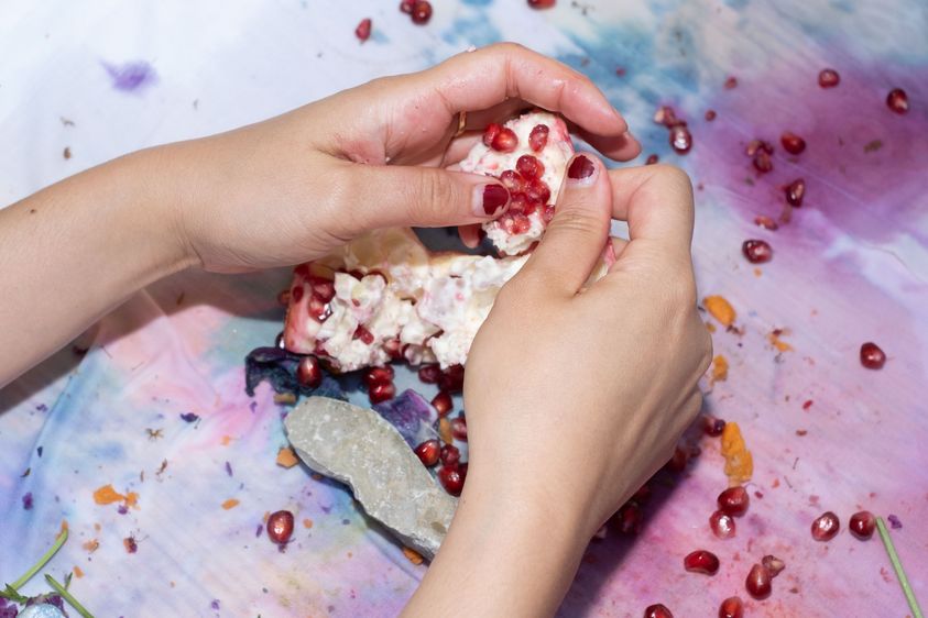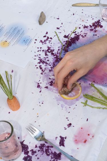 Das Färben von Textilien und anderen Materialien mit Pflanzenfarben gehört seit Jahrhunderten zu einer der bedeutendsten kulturell-handwerklichen Traditionen Thüringens. Der Fachkurs fand in Kooperation mit dem Thüringer Färbedorf Neckeroda e.V. statt und bot den Studierenden Grundlagenwissen zu heimischen und generellen Färbepflanzen und ihren Färbeanwendungen. Der Intensivkurs, im ortsansässigen Färbezentrum, brachte den Studierenden den Anbau von lokalen Färbepflanzen, deren Pflege und Verarbeitung, die Herstellung von Färbedrogen, sowie Woll- und Stoffverarbeitung nahe. Die Studierenden entwickelten innerhalb des Kurses eigenständige künstlerische/gestalterische Ideen/Projekte/Experimente zur Umsetzung. Als zusätzliche Abschlussarbeit findet ein performatives Dinner-Event mit elf Gängen und allen Beteiligten im Garten des Palais Dürckheim statt. Hierbei werden färbende Lebensmittel choreografisch genossen, gleichzeitig in ein großes textiles Tuch eingebracht und so dokumentiert. Das Ergebnis wird als Installation auf der SUM präsentiert.