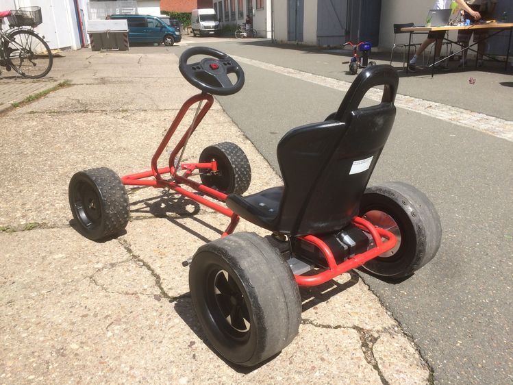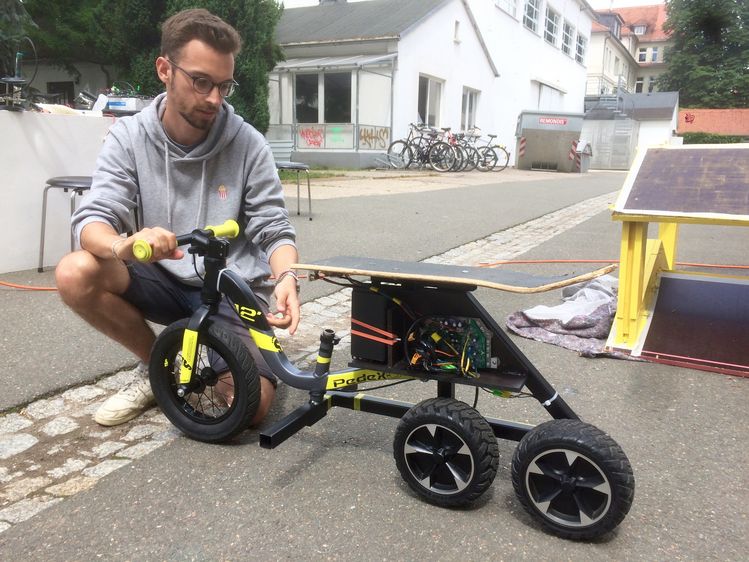 Anhand des Baus eines Transportgerätes erlernten die Studierenden den Umgang mit dieser Technologie und deren Ansteuerung. Das Ausgangsmaterial für alle Teilnehmer*innen war ein Set bestehend aus einem handelsüblichen 8,5“ Hoverboard für Kinder (Motoren, Akku, Elektronik), einem Arduino Mikrocontroller (Adafruit QT Py) und zwei Magnetfeldsensoren. Um die Hardware des Hoverboards nutzen zu können, wurde die Software des Geräts vollständig umprogrammiert. Parallel dazu musste ein eigenes Vehikel konstruiert werden, in das alle Komponenten integriert wurden.