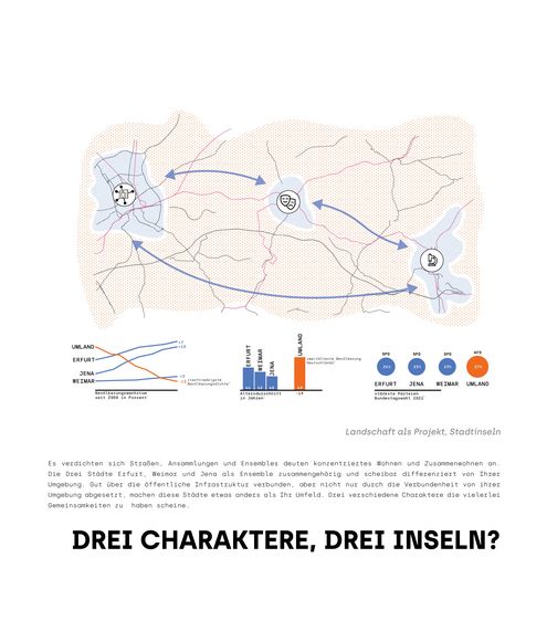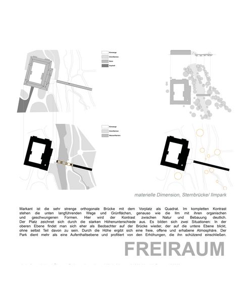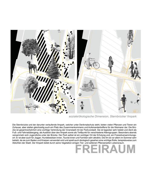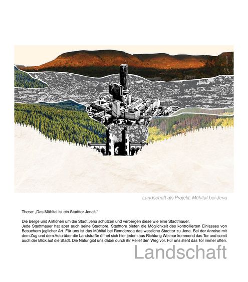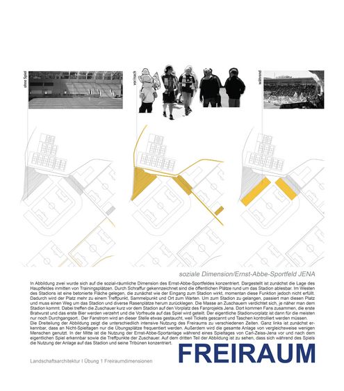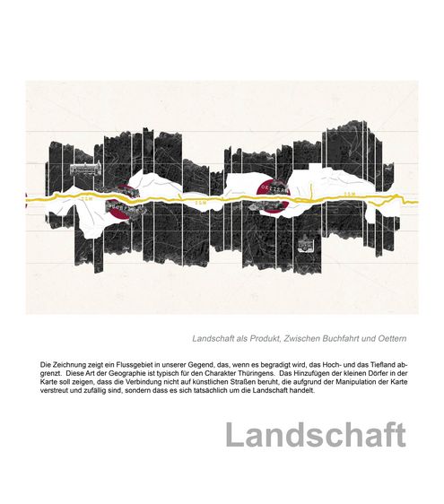 Innerhalb der Vorlesung „Entwerfen und Theorie in der Landschaftsarchitektur“ haben Studierende explorative und interpretative Mappingübungen zu landschaftlichen und freiraumplanerischen Themenfeldern bearbeitet. In der Übung "Freiraumdimensionen" analysierten die Studierenden einen städtischen Freiraumtypus hinsichtlich seiner materiellen, ökologischen/sozialen sowie ästhetisch-emotionalen Dimensionen. Für die Übung Landschaft als Palimpsest wurde in Anlehnung an André Corboz die "gelebte Beziehung zwischen einer topografischen Oberfläche und der dort ansässigen Bevölkerung" in den Blick genommen. Die Landschaft zwischen Erfurt und Jena wurde hinsichtlich ihrer Wechselbeziehungen zwischen naturräumlichen Bedinungen und menschlichen Wirtschaftens und Lebens betrachtet (Landschaft als Produkt), sowie die mit dieser Landschaft verbundenen Bedeutungszuschreibungen aufgedeckt (Landschaft als Projekt).
