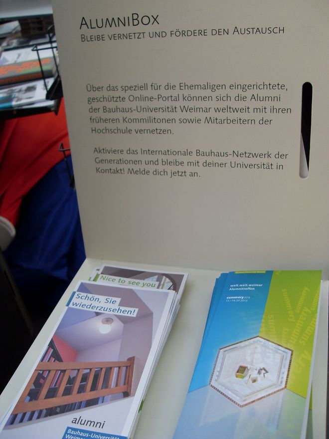 Zum nunmehr fünften »welt.weit.weimar«-Treffen wurden ca. 250 Alumni auf dem sonnenüberfluteten Campus vor dem Bauhaus.Atelier in diesem Jahr herzlich von Juniorprofessorin Dr. Steffi Zander, Professur Instructional Design – Didaktik medialer Lernumgebungen an der Fakultät Gestaltung, begrüßt. Viele Ehemalige nutzten an diesem Wochenende intensiv die sich im Rahmen der summaery bietenden Werkschauen und viele Gespräche mit den Studierenden, um ihre Alma Mater in ihrer Entwicklung zu erleben, Neues zu erfahren. Und der »Kleine Sektempfang« am Samstag ist in den letzten Jahren als Podium für den anregenden Austausch zwischen Alumni, Studierenden und Lehrenden bereits fester Bestandteil der summaery. In diesem Jahr sorgten Superjune & the Tikiwaves mit ihrer inspirierenden, Laune machenden groovigen Musik für eine ausgelassene Stimmung. Zudem war die Band auch in diesem Jahr wieder etwas ganz Besonderes für die Anwesenden, denn sie besteht aktuell hauptsächlich aus Professoren und Studierenden der Bauhaus-Universität Weimar.