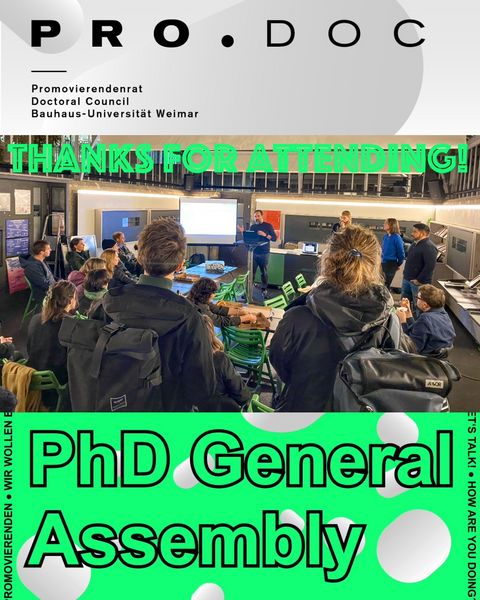 The doctoral council Pro.Doc of the Bauhaus-Universität Weimar has been actively advocating for the interests of doctoral candidates since 2021. In close cooperation with the university's various committees, we continuously bring the interests of doctoral candidates into university policy and represent our concerns not only within the university, but also outside of it.