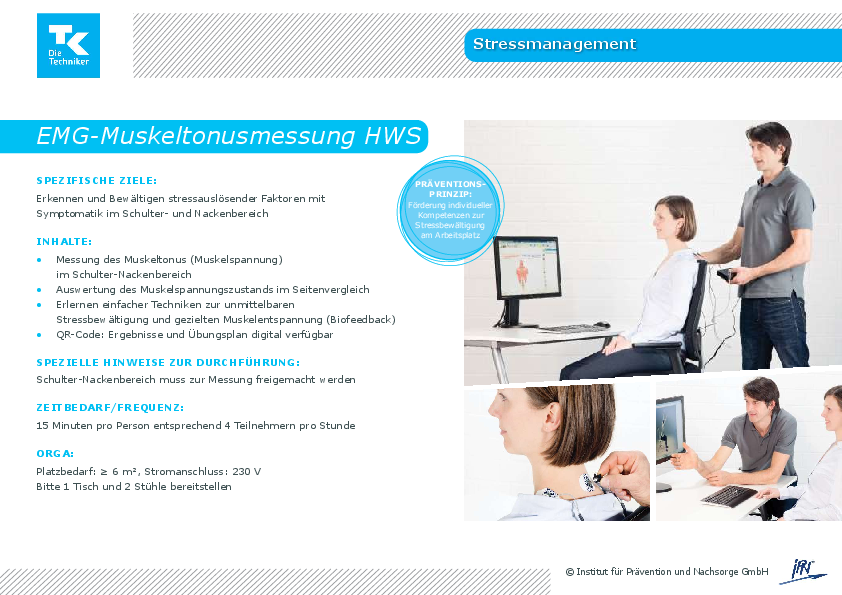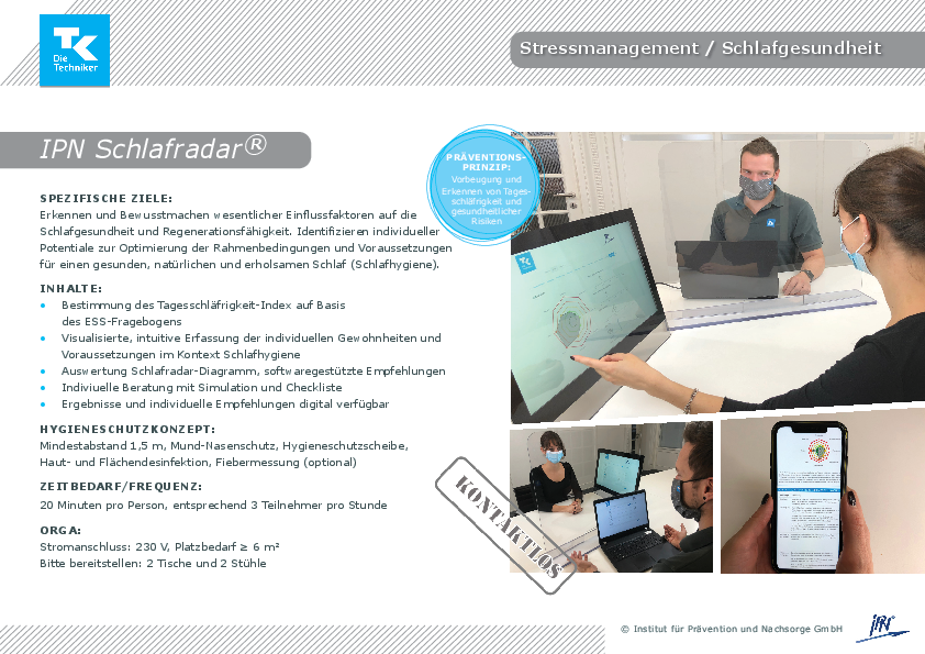 Mit Hilfe der angebotenen Check-Ups haben Sie die Möglichkeit, ihr persönliche Gesundheitssituation in den Bereichen Schlafgesundheit / Stressmanagement (IPN Schlafradar®), Rückengesundheit (Wirbelsäulenscreening), Stressmanagement (EMG- Muskeltonusmessung HWS) und ihr Schulter- und Nackenmuskulatur (IPN Neck Check®) zu testen. Im Anschluss an die Tests erhalten Sie eine individuelle Auswertung sowie Tipps, Empfehlungen und Übungen für Ihren Alltag.