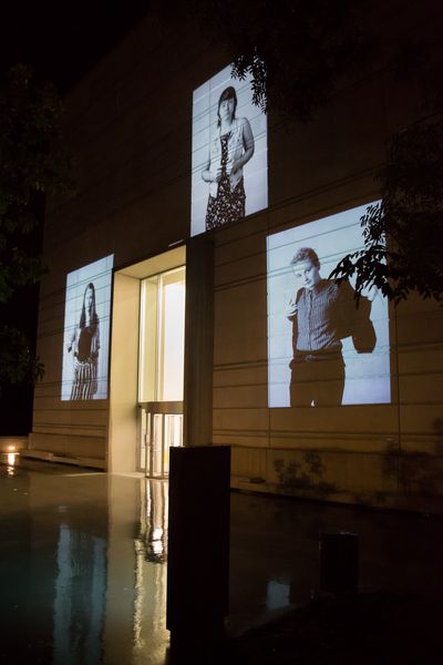 Das Porträt von Tina Meinhardt wird zusammen mit zwei weiteren Porträts aus Larissa Barths Fotoserie walter ≠ bauhaus auf die Fassade des Bauhaus-Museums Weimar projiziert.