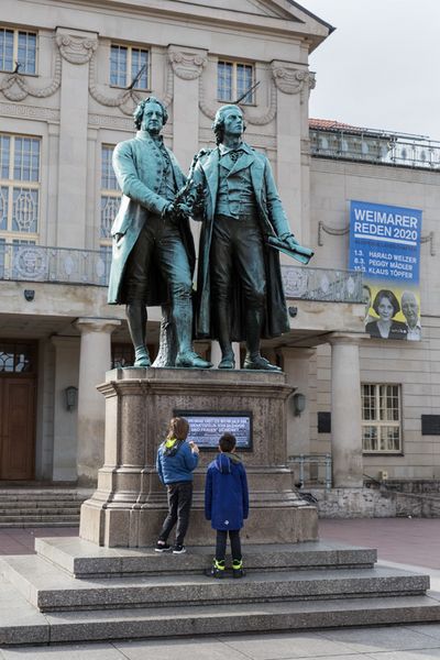 Das Goethe-und-Schiller-Denkmal auf Weimars Theaterplatz. Die metallene Gedenktafel zu Füßen der beiden Dichter wurde mit einem Plakat verhängt. Das Plakat trägt die Aufschrift: »In Weimar gibt es mehr als 200 Gedenktafel. Nur 24 davon sind Frauen gewidmet.« Foto: a. sophron.