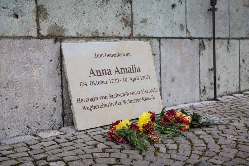 Larissa Barths Gedenktafel für Anna Amalia lehnt an der Außenmauer der Herzogin-Anna-Amalia-Bibliothek. Auf dem Kopfsteinpflaster davor liegen rote und gelbe Blumen. Die Inschrift der Kalksandstein-Tafel lautet: Zum Gedenken an Anna Amalia (24. Oktober 1739 - 10. April 1807) / Herzogin von Sachsen-Weimar-Eisenach / Wegbereiterin der Weimarer Klassik.