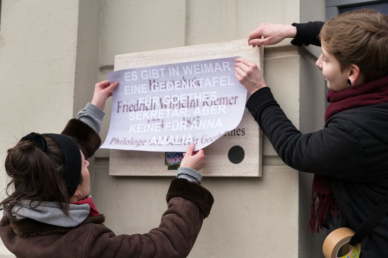 Larissa Barth (rechts) und ihre Partnerin (links) verhängen die Gedenktafel für Goethes Sekretär, Friedrich Wilhelm Riemer, in Weimars Amalienstraße. Das Plakat, mit dem sie Riemers Gedenktafel verdecken, trägt die Aufschrift: Es gibt in Weimar eine Gedenktafel für Goethes Sekretär, aber keine für Anna Amalia.