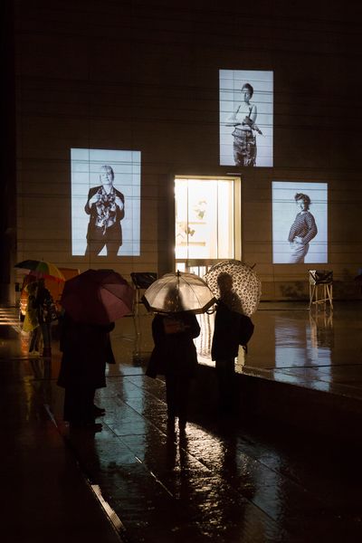 Das Foto zeigt 2 Schwarz-Weiß-Porträts aus Larissa Barths Fotoserie walter ≠ bauhaus, die auf die nächtliche Außenfassade des Bauhaus-Museums Weimar projiziert werden. Passant*innen mit Regenschirmen stehen auf dem Museumsvorplatz und betrachten die Bilder.