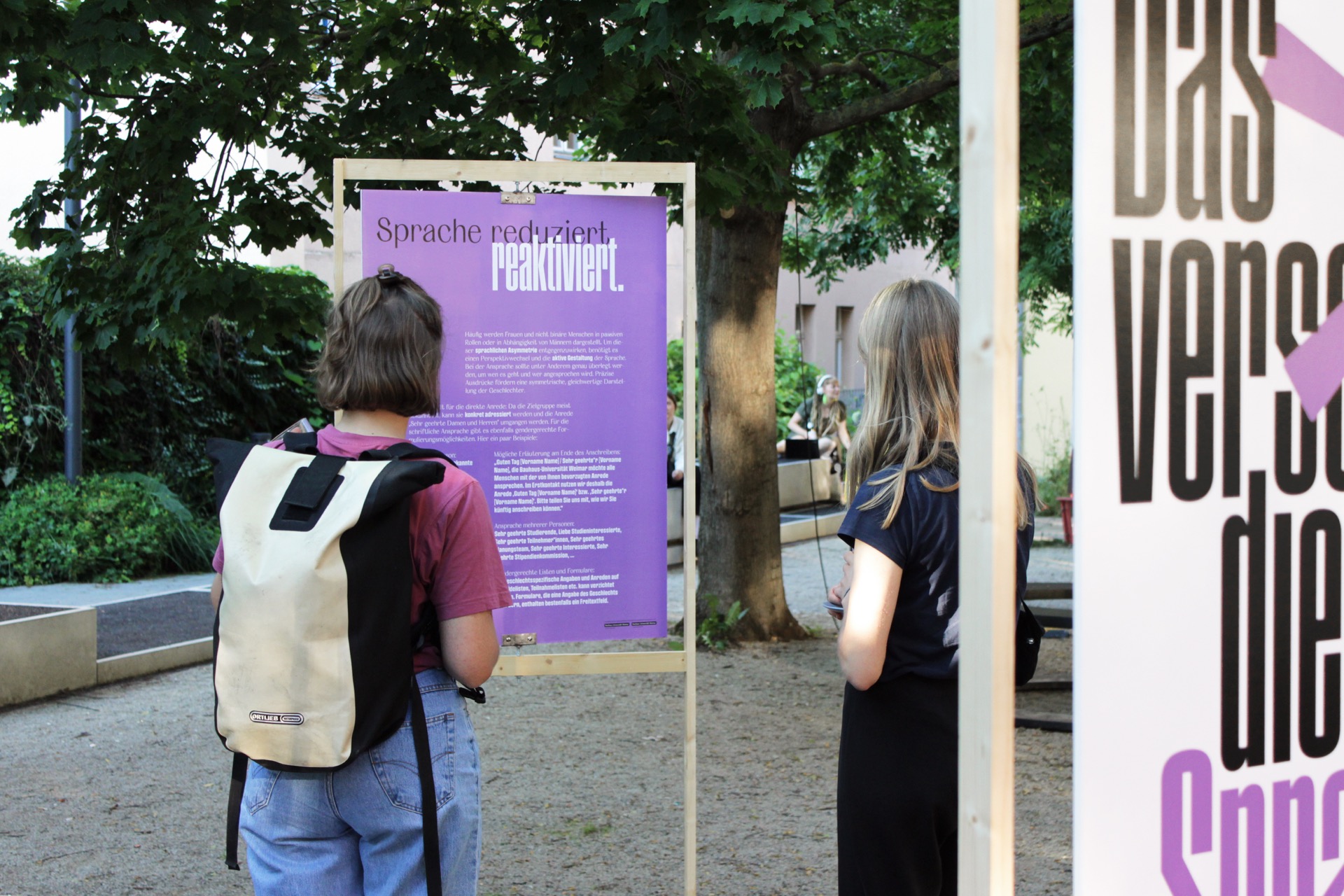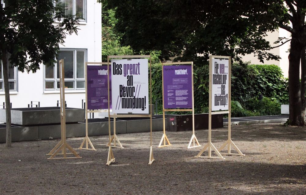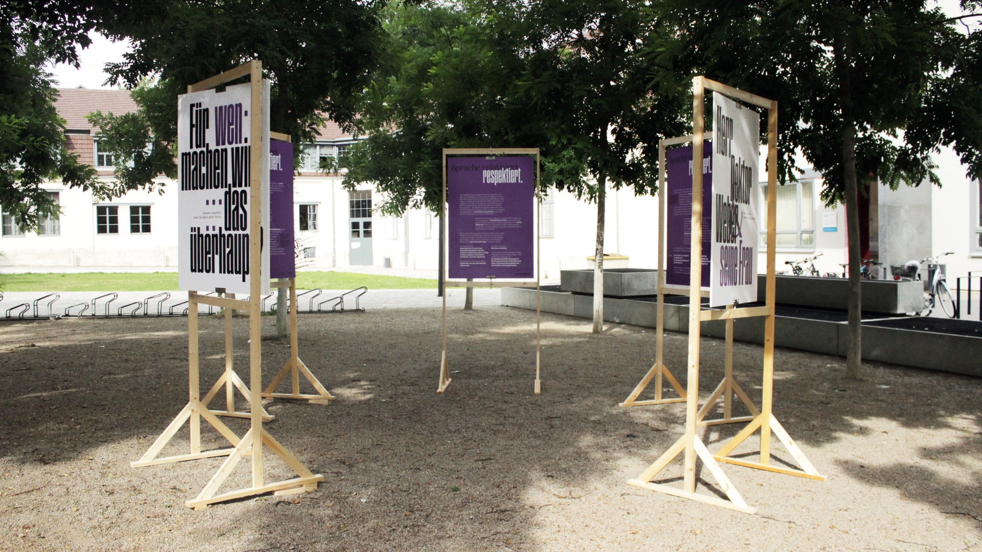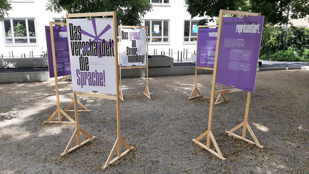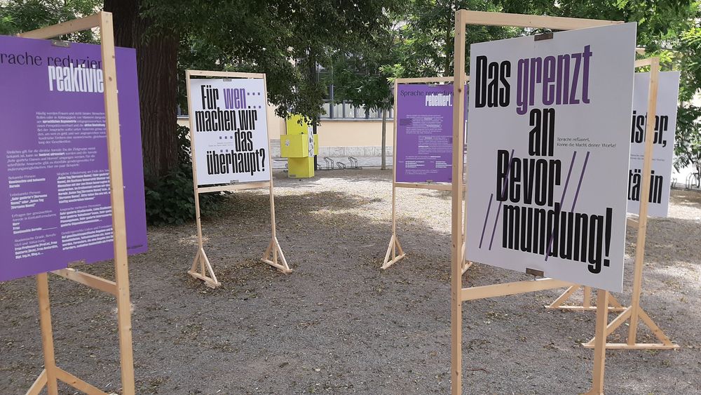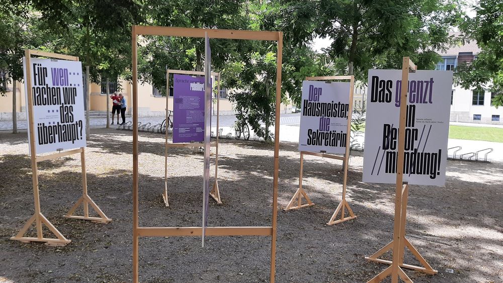als visuelle Unterstützung des Sprachleitfadens »Sprache gemeinsam verändern« des Gleichstellungsbüros der Bauhaus-Universität Weimar. Die Idee dazu entstand im Rahmen des Fachkurses »Make Them Seen, Make Them Heard« unter der Leitung von Jonas Beuchert und Tilman Schlevogt (Lehrbeauftragte der Professur Typografie und Schriftgestaltung, Fakultät Kunst und Gestaltung) und in Zusammenarbeit mit dem Bereich Diversität und dem Gleichstellungsbüro der Bauhaus-Universität Weimar. In der Woche vom 15. bis 22. Juli 2021 war die Installation auf dem Vorplatz zwischen Hauptgebäude, Campus.Office und M18 zu sehen.