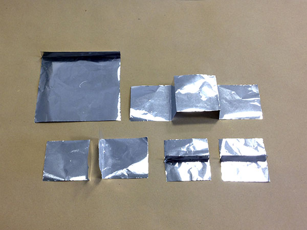 Squares and rectangles of aluminium foil with parallels to different electrical parts.