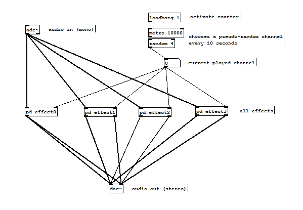 For this effect I used the pitch example in the PD-documentation by Miller Puckette. The pitch requires a certain span of audio, therefore we need to use an array. Because I did not wanted to have a static factor for the pitch I create a sine wave as factor to modulate the input. For every instance a pseudo-random growth rate and pitch range are generated.