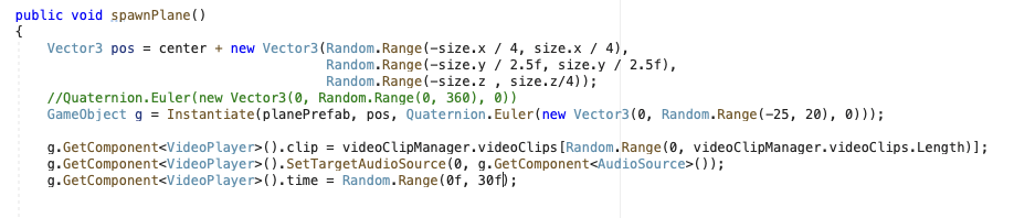 - All the video clips on the quad game objects in position, rotation, time frame point are randomly chosen and created through the scripts.