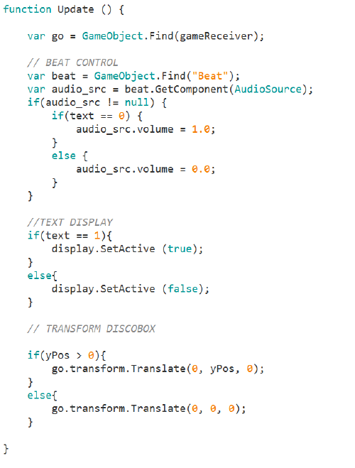 In our update function we check the values of the osc message stream. We have set up controllers for the audio source with the beat loop and also a controller to display the text and another one for moving the dance floor.