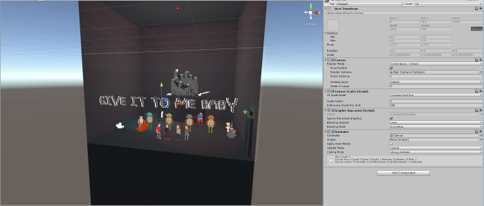 For our text which appears on the screen we simply created canvas element. We set the "Render Mode" to "Screen Space - Camera" so it fits to the Maincam and attached the Main Camera object to the Canavs.