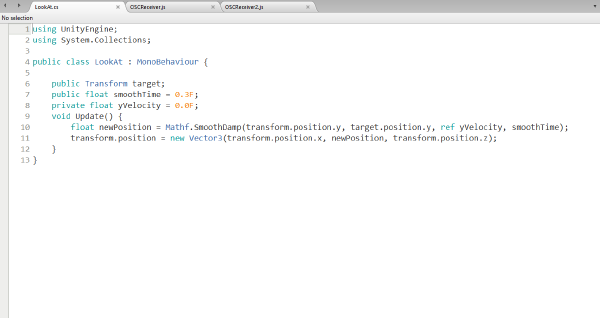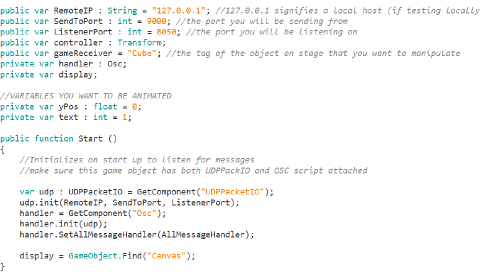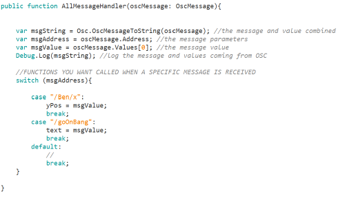 Therefore we send the OSC message ( /goOnBang $1 ) to the PC running Unity, via OSC.