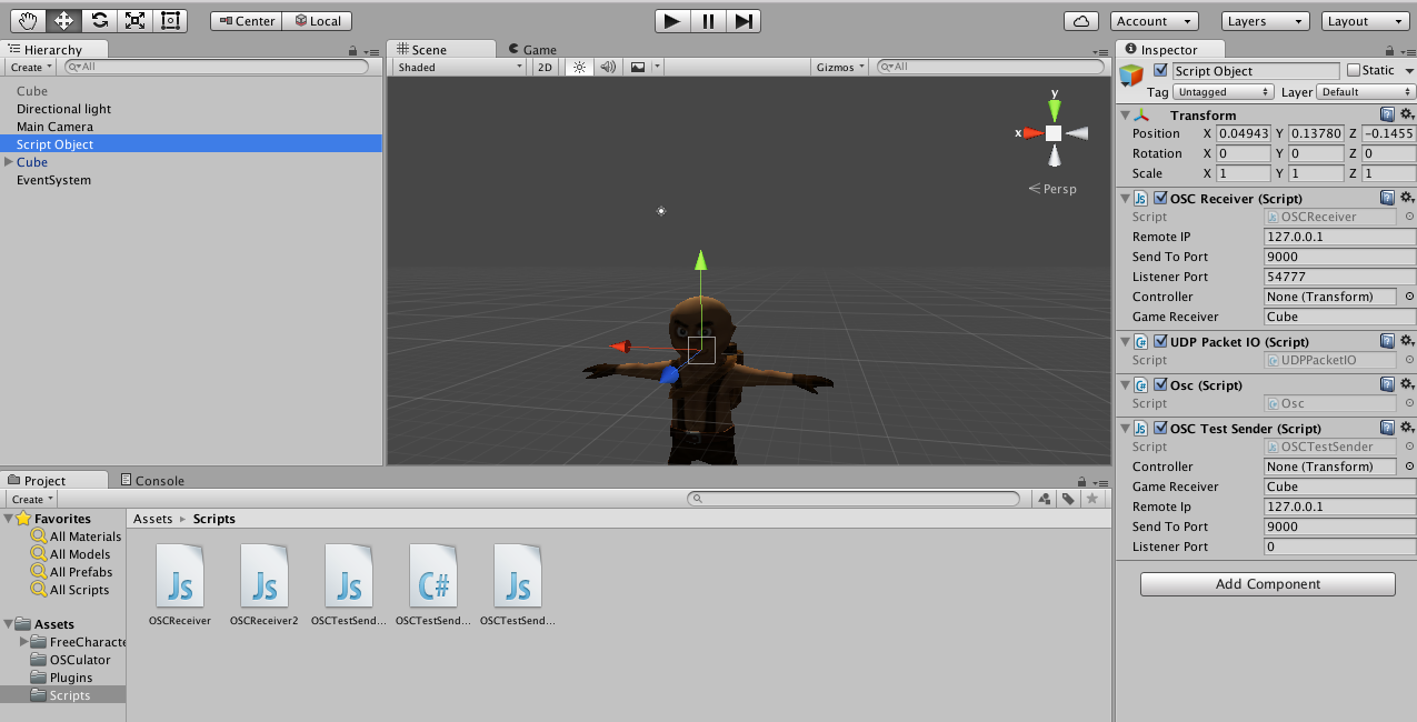 Unity gets the OSC-messages with a script like this (google might help):