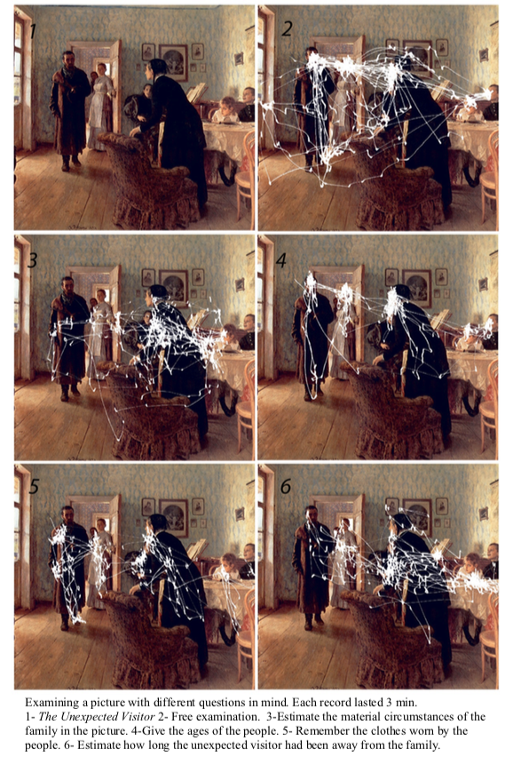 In his famous experiment, Yarbus asked the same individual to view the same painting seven times, each time with a different instruction before starting to view the image. Yarbus repeatedly studied one painting titled An Unexpected Visitor by the Russian painter Ilya Repin. He gave instructions such as “give the ages of the people” or “remember the clothes worn by the people” prior to viewing. These instructions asked the viewer to make a series of judgements about the scene, to remember aspects of the scene, or simply to look at it freely. The eye-tracking patterns recorded by Yarbus showed that the subjects visually interrogate the picture in a completely different way depending on what they want to get from it. Based on the evidence of his eye tracking studies, Yarbus speculated that the eyes would be attracted to areas packed with information. As Yarbus observed: “Depending on the task in which a person is engaged, ie, depending on the character of the informaton which he must obtain, the distribution of the points of fixation on an object will vary correspondingly, because different items of information are usually localized in different parts of an object.”