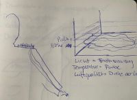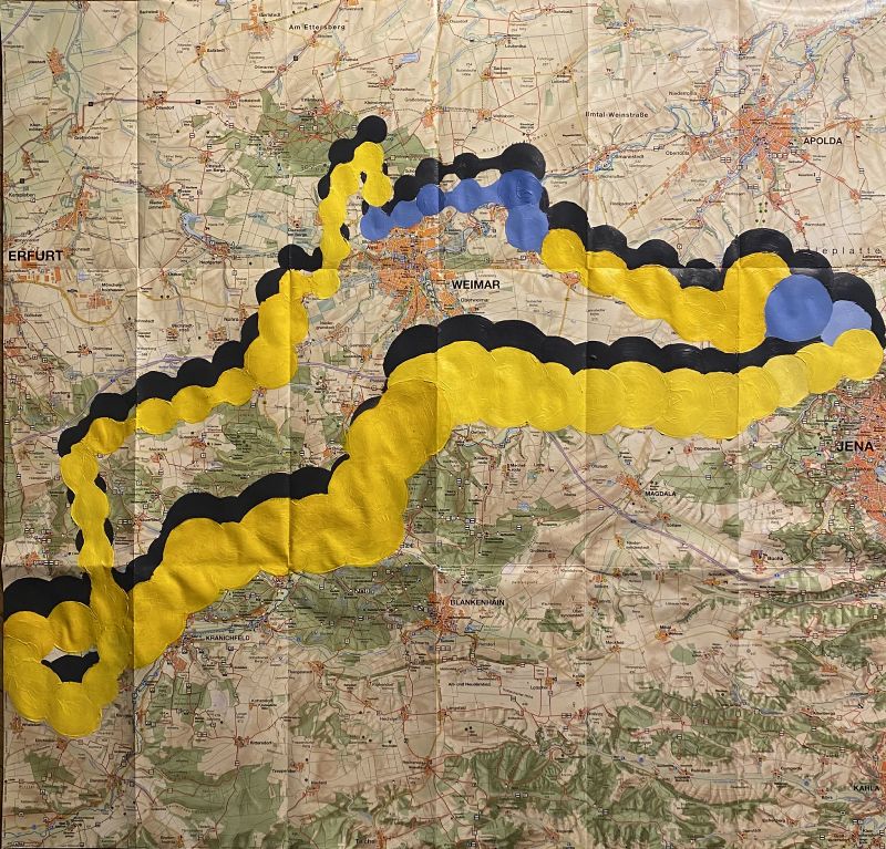 On the route, light, air quality, temperature and the walkers pulse are measured every minute using an Arduino and sensors. These are stored via an SD card and read out with a code. The time and route are stored using a tracking app.The data determines the parameters of the subsequent image design. For transport, a "rack" is built that attaches the breadboard to the body. After each walk the collected data will be transscripted and painted with onto a map that shows the walked area. In order to associate the data to the correct point of the line the pace througout the walk has to be steady.