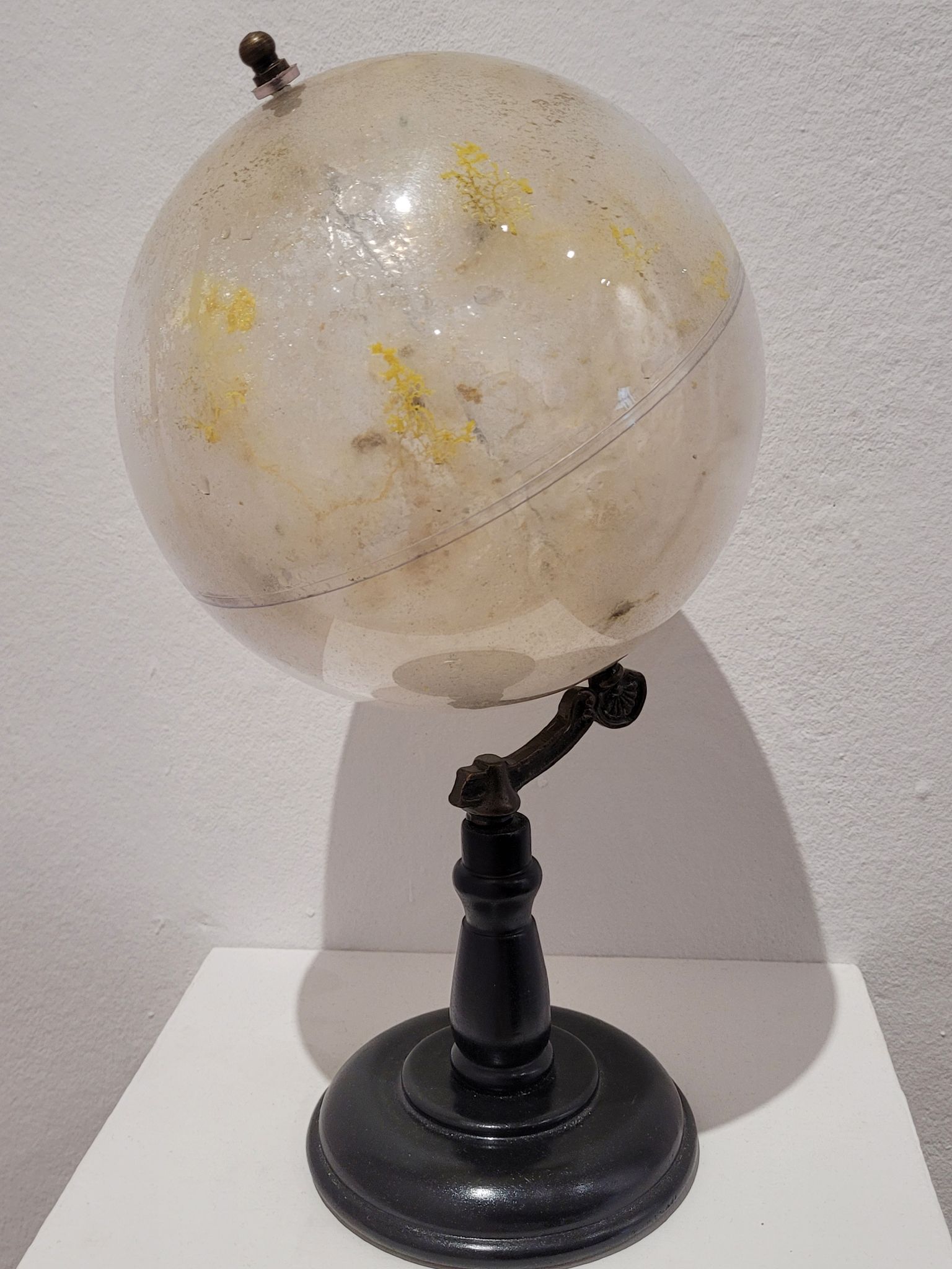 The migrant's Cabinet: This is a work in process composed of several components: There is a world map globe, whose sphere has been replaced by a transparent acrylic one. Inside it I have grown slime mold. On a linen flag hanging from a flagpole embedded in the wall, approximately 2 meters high, I am sewing with golden thread words that I extract from testimonies that I am collecting from Cuban migrants, printed on papers. These testimonies answer questions such as: When, how and where did you emigrate? by what route, route or routes? Why did you emigrate? What were you looking for? What were you escaping from? What are you still looking for? I attach the pieces of paper with the testimonies to the linen in a branched manner, as if tracing map routes or webs of the slime mold itself. There will also be three hemispheres, similar to the larger globe, with maps delicately engraved or printed on this transparent material. Inside, I will plant the slime mold samples in the place where Cuba is drawn on the map, feeding those organisms in the zones where other places are drawn (places in the world where the Cuban diaspora settles), creating the slime mold to "migrate" inside these small maps, emulating the Cuban migratory routes.