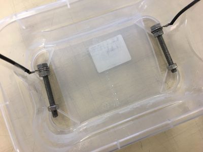 => Still turning bleu. Even with smaller electrodes that are completely covered by the solution (buffer TAE 50x + distilled water) So I decided to test if this oxidation is coming from the buffer or if it is simply a natural process => #Fourth attempt