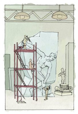 She meets a sculptor who is working on a large marble figure in a workshop.
