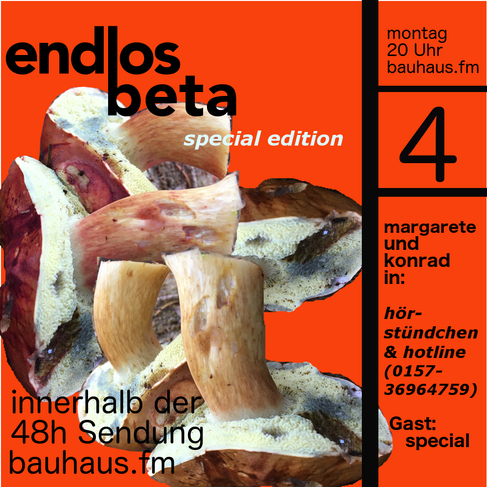 Die vierte Ausgabe von endlos.beta war anlässlich des 48Stunden-Sonderprogramms bei bauhaus.fm eine Spezialsendung mit verschiedenen Hörstücken von Margarete und Konrad. Außerdem gibt es einem Specialguest.