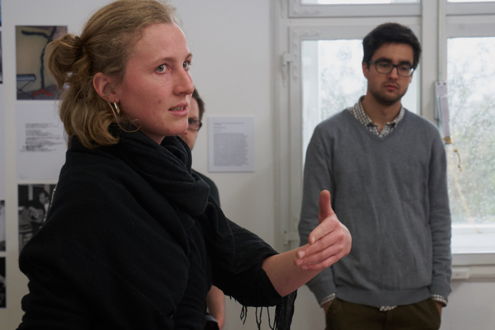 Konrad Behr, selber einer der ausstellenden Künstler, sprach mit den Masterstudierenden Sara und Julien über den Entstehungsprozess der Ausstellung sowie die spannungsvolle Kooperation von praktizierenden Künstlerinnen und Künstlern und in der Vermittlung arbeitenden Studentinnen und Studenten.