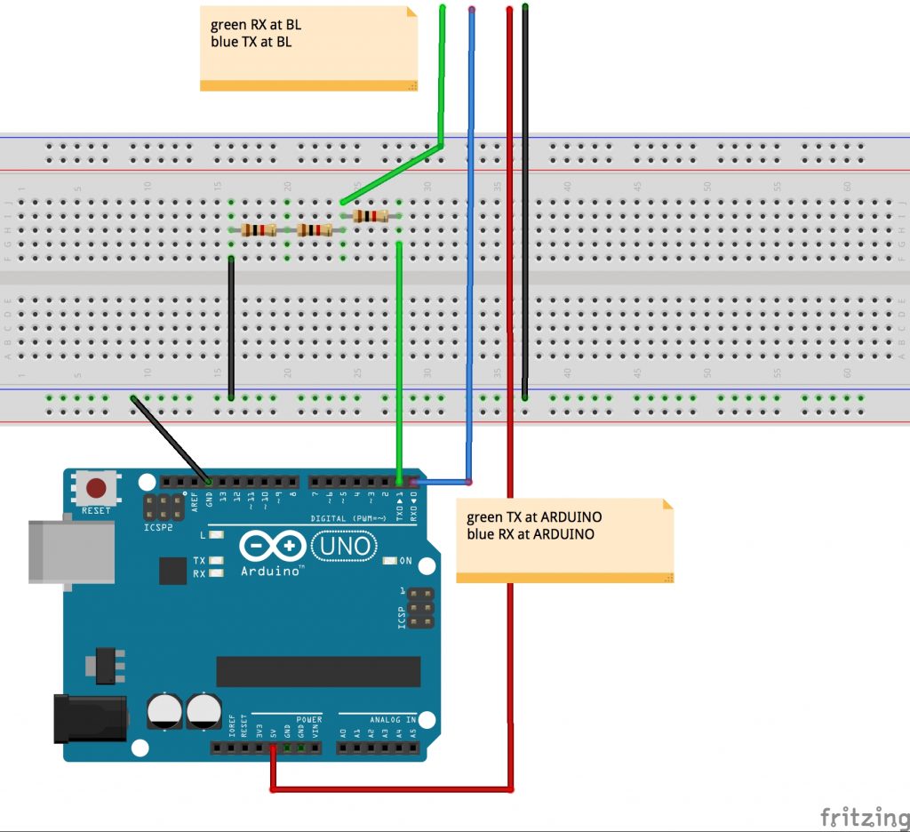 First things first, we need to setup our devises. Here the resistors are 100 Ohm each. This is due to the TX/RX needing 3.3V. Also keep in mind, that the RX goes to TX and vice versa.
