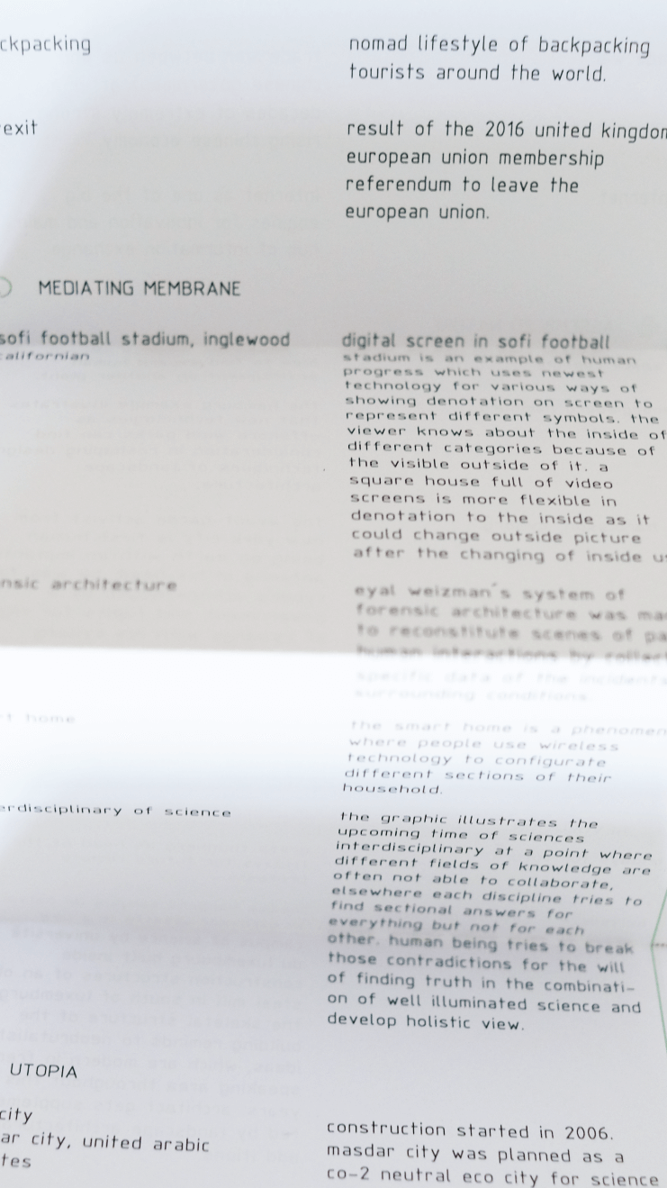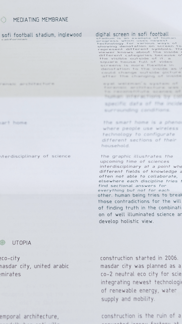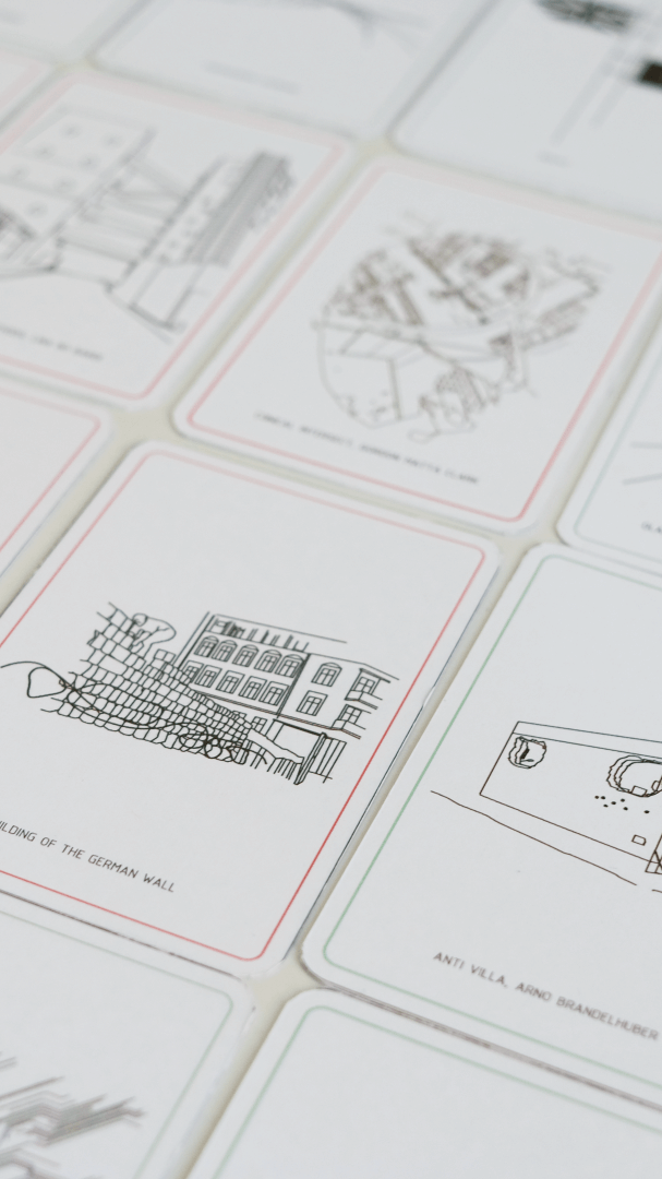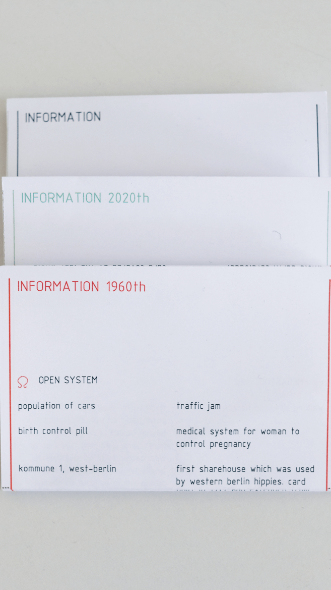 The card game is a set of 48 trigger cards and 24 blank cards (to be prepared) The trigger cards are split in different time periods, each marked in another colour. The starting version of the game consists of trigger cards from the 1960th and the 2020. additional periods need to be marked in a new colour and registered in a list. There are six main concepts, each split in four subtopics, prepared for the different trigger cards. These concepts are marked through a symbol on the backside of the card and the colour related to the time period they belong to. On the frontside of the cards there is a drawing of an input and a description. You can find some background information about each of the drawings on the frontside of the card in a list, which also is an (open)archive, to which players can add information.