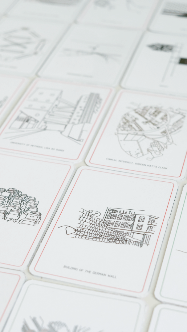 The game invites the players to figure out relations between seemingly different ideas to develop another level of information. The association process would trigger an internal conversation or a conversation with others. With more images and less text, the interactive card kit attempts to work beyond restrictions of spoken languages and disciplinary languages, allowing the players to find a common form of communication to discuss the idea generated in relating the cards. The players can respond performatively by sketching, by creating a response to the two cards as freely as possible.