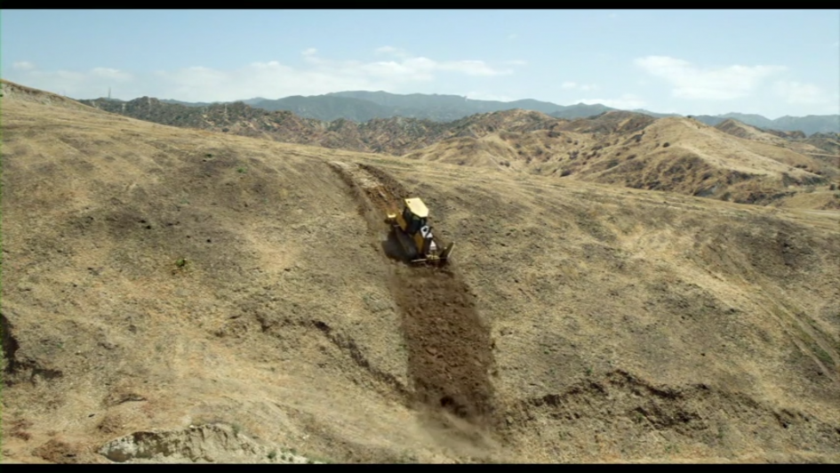 Das Titelgebende Material, Erde, verhandelt der Film nicht nur als ein Material, das extrahiert werden müsste, um an wertvollere Ressourcen zu gelangen, sondern auch in ihrer basalen Funktionen als Boden oder Grund. Jede Maschine, die durch das San Fernando Valley fährt hinterlässt dabei tiefe Spuren, die aus der Vogelperspektive an ein Gemälde erinnern.[4] Sie referenzieren damit zwei Effekte, die bereits der klassische Zelluloid-Film enthielt: Bewegung und Spur. Bewegung gehört zu den Grundeigenschaften eines jeden Films, insofern es sich um bewegte Bilder handelt. Bereits die erste Schrifteinblendung im Film erweitert die Verhandlung von Bewegung als filmisches Grundelement auf das Bewegen tatsächlicher Materialien in der biophysischen Welt. Genauso wie ein herausgeschnittener Marmorblock in Carrara, wird der Zelluloidfilm im Projektor als Ressource des Leinwandbilds bewegt, um die hintereinanderliegenden Einzelbilder in Bewegung zu setzen und Film damit überhaupt erst als kohärentes Leinwandbild emergieren zu lassen. Auf dieser Ebene transformiert Geyrhalters Film die Bewegung komplexer Extraktionsunternehmungen in eine Referenz an die Bewegung des Films im Projektor. Es wäre sogar ganz richtig zu erwähnen, dass in beiden Fällen fossile Ressourcen bewegt werden: Der Filmstreifen selbst besteht zum Großteil aus einem Nebenprodukt der Förderung von Öl und ist damit eingebettet in einen ökologischen Kontext komplexer Extraktionsverfahren in der biophysischen Welt. Diese Verstrickung des Films in environmentale Ressourcenextraktionsprozesse bringt Nadia Bozak auf eine simple aber entscheidende Formel, wenn sie in ihrem Buch The Cinematic Footprint formuliert: „Embedded in every moving image is a complex set of environmental relations.“[5] Der Bulldozer, der in der zweiten Einstellung Erde einen Abhang hinunterschiebt, führt damit die doppelte Verstrickung des Films, der einmal Ressourcenextraktion und das Umgestalten der Landschaft präsentiert und dies gleichzeitig aber auch mitverursacht, auf. Der Film wurde aber nicht auf Zelluloid gedreht, sondern mit digitalen Kameras. Das macht ihn allerdings nicht immateriell. Im Gegenteil, zu glauben digitale Bilder seien immateriell ist, wie Bozak es formuliert, eine Mythologie: „like analog formats, digital is industrial and each image consumed bears a material life. Images come somewhere and are plugged into an energy economy that is becoming less of a phantasm.”[6] Erde, in ihrer Funktion als Boden, auf dem zu fahren sein wird, ist damit als ein Inskriptionsmedium formuliert, das die Bewegung, die den Film hauptsächlich ausmacht (die der Maschinen), verzeichnet und ausstellt.
