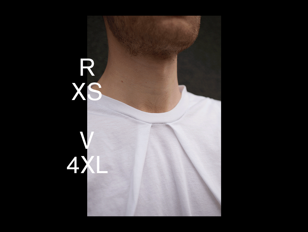 Diese Arbeit besteht aus zwei T-Shirts und zwei Hosen (jeweils in in den Konfektionsgrößen 4XL und XS) von denen jeweils Vorder- und Rückseite vertauscht und neu miteinander vernäht wurden. (R=Rückeite, V=Vorderseite)