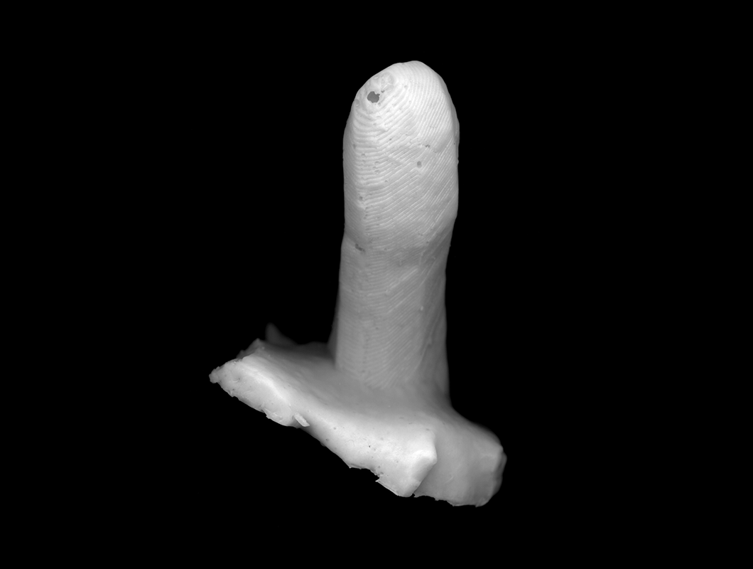 In »Default-Identity« wurde die Hand eines 3D-Charakters, welcher bereits in einem Programm standardmäßig voreingestellt ist, isoliert und auf einem 3D-Drucker ausgedruckt. Von dieser Hand wurde ein Finger in Alginat abgegossen und ein Fingerabdruck genommen. Ließe sich mit ihm ein Smartphone entsperren oder ein Personalausweis ausstatten?