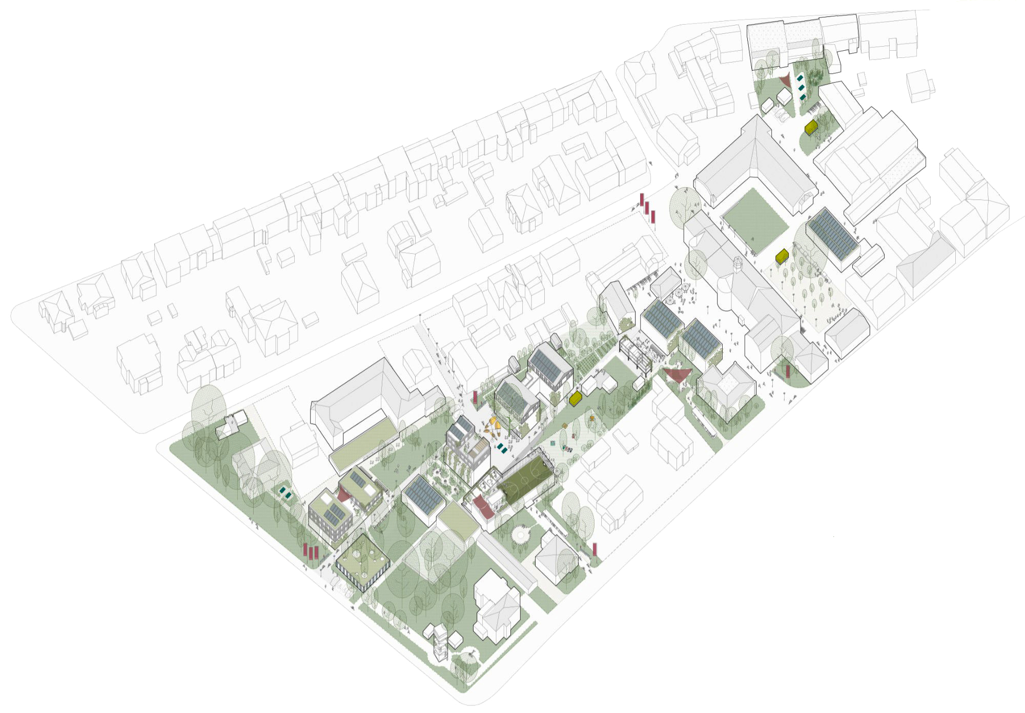 Aufgabe im städtebaulichen Entwurf des Sommersemesters 2021 war es, diesen Ort in sein Gegenteil zu verwandeln: ein Musterbeispiel für Dekarbonisierung und nachhaltiges Bauen. Dabei soll auch ein Treffpunkt für die gesamte Universität entstehen, ein Campus, der den Namen verdient, ein gemeinschaftlicher Ort mit allen denkbaren Annehmlichkeiten und Qualitäten.