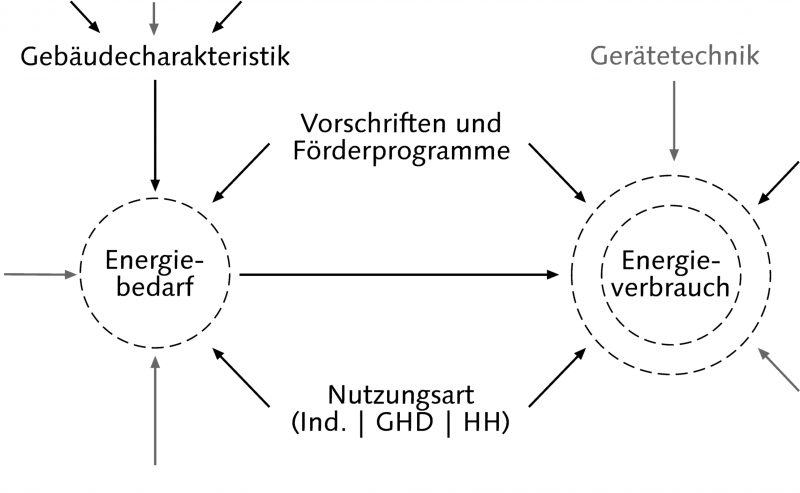 Energieverbrauch und Energiebedarf sind demnach begrifflich zwar eng miteinander verbunden, werden aber von unterschiedlichen Größen beeinflusst. Während die Ermittlung des Bedarfs, als theoretischer Wert mit standardisiertem Verhalten, mehrheitlich durch die Gebäudehülle und die geografische Lage geprägt wird, spiegelt der Verbrauch existente Messwerte wider, die zusätzlich vom Nutzerverhalten - als essentielle Einflußgröße - und der Art der Energiebereitstellung abhängen. Im Idealfall verhält sich der Nutzer adäquat der Bedarfsermittlung, was in der Praxis jedoch nicht vorkommt. Einfluß auf beide Kenngrößen haben die Nutzungsart, also Industrie, Gewerbe, Handel, Dienstleistung (GHD) und Haushalte sowie die rechtlichen Anforderungen und Förderprogramme. Die Begrifflichkeiten sind als Einflüsse in Pfeilrichtung zu verstehen. Prinzipiell ließen sich die Verästelungen immer weiter detaillieren und münden letztlich in Akteuren. Als Beispiel seien hier die bauphysikalischen Eigenschaften benannt, die auf Boden - Fassade - Dachfläche aufteilbar sind und sich dann wiederum über die Einzelelemente bis zum Hersteller fortführen lassen. Diese Zusammenhänge können dann allerdings nicht mehr zweidimensional bzw. ohne Ebenen dargestellt werden.