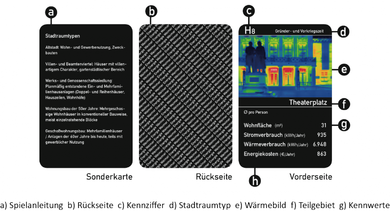 Quartettspiele sind ein bewährtes Mittel, um insbesondere technische Themen einem breiten Publikum zugänglich zu machen. Das im Rahmen eines studentischen Projektes entwickelte Quartett soll die Mitspieler nicht belehren, sondern interessante Fragen aufwerfen: In welchem Stadtviertel sind die Energiekosten am höchsten? Wo wird am meisten Strom und Wärme benötigt? Und welchen Zusammenhang gibt es zwischen Bauweise, Wohnfläche und Energieverbrauch? Das Energie-Kartenspiel lässt Weimarer Stadtviertel gegeneinander antreten und soll spielerisch und unterhaltsam Aufmerksamkeit erzeugen.