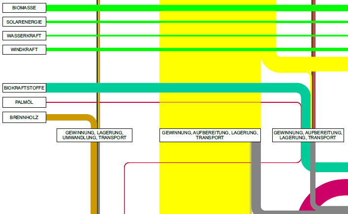 Die Grundstruktur der Informationsgrafik bildet ein digitales Poster. Auf einen kurzen Einleitungstext folgen vier Kapitel, die in Leserichtung von links nach rechts und von oben nach unten durch die dargestellten Inhalte führen. Zusätzliche Informationen sind mittels Hyperlinks auf verknüpfte externe Dokumente abrufbar. Die einzelnen Kapitel sind durch unterschiedliche Informationsebenen strukturiert: Die erste Informationsebene ermöglicht einen Überblick über die gesamte Grafik; Die zweite Informationsebene stellt die wichtigsten Inhalte dar; Die dritte Informationsebene enthält zusätzliche Erläuterungen; Die Zuordnung der Inhalte zu den unterschiedlichen Ebenen ermöglicht eine dem Informationsbedarf entsprechende Nutzerführung: Die für die Anwender relevantesten Informationen sind auf der obersten Informationsebene unmittelbar lesbar, eine eingehendere Betrachtung erfolgt erst auf den darunter liegenden Ebenen. Durch die dezente Animation einzelner grafischer Elemente wird die Aufmerksamkeit der Anwender sukzessiv von der obersten Informationsebene auf die unteren Ebenen gelenkt.