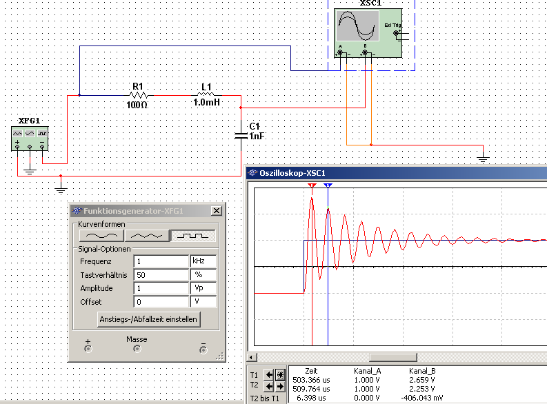 Wie im Fenster des Oszillographen zu sehen hat die Schwingung eine Periode von ungefähr 6,4µs, was einer Frequenz von 156,25 kHz entspricht.
