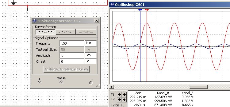 Die Resonanzfrequenz befindet sich, wie zu oben sehen, bei circa 158kHz. Die Phasenverschiebung beträgt hier ca. 83° und die Resonanzüberhöhung ~20dB (ca. das Zehnfache des Ausgangswertes).