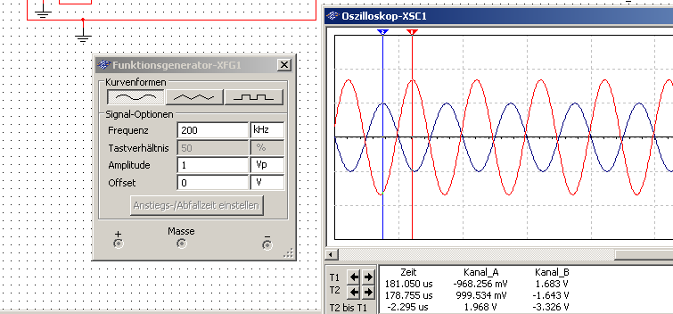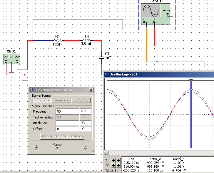 Es folgt eine genauerer Untersuchung verschiedener Frequenzen für Sinusschwingungen mit Multisim. Beispielhaft sollen hier drei Screenshots gezeigt werden: